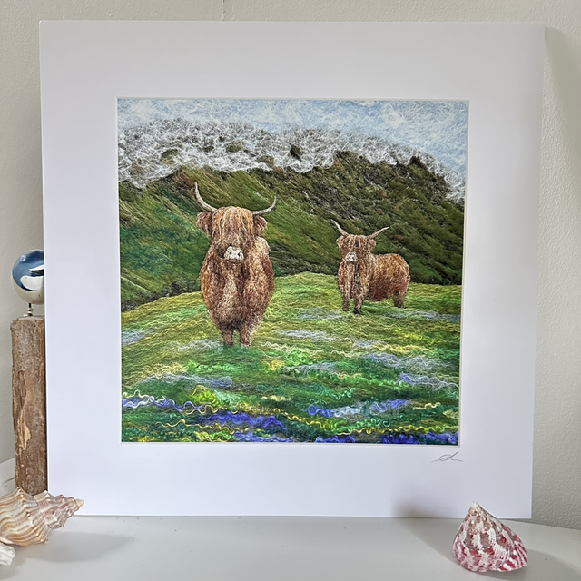 A beautiful mounted print of Coos & Bluebells. Shoes all the fibre detail of the original.