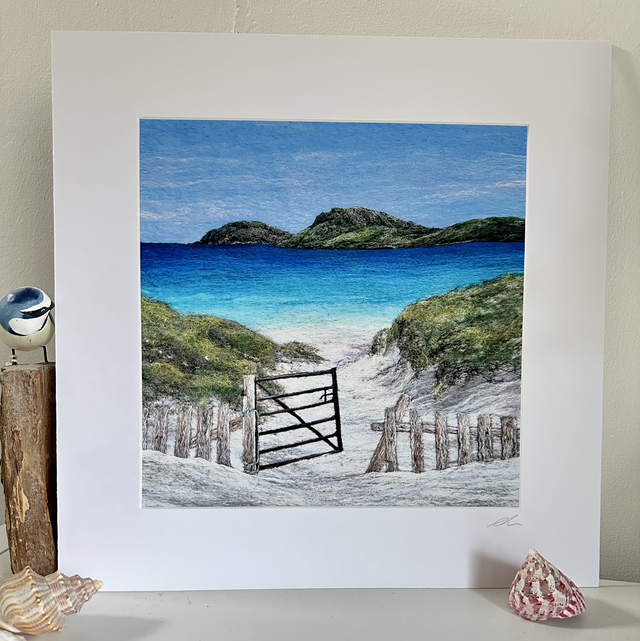 A stunning Giclee print of Vatersay Beach. Shows all the fibre detail of the original artwork.